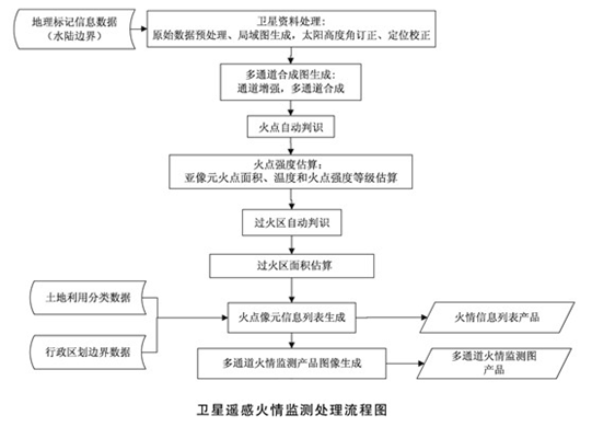 遙感火點(diǎn)識別的基本原理就是運用遙感衛星對地球表面進(jìn)行掃描,通過(guò)衛星地面站把掃描信息接收下來(lái),再利用計算機對這些信息進(jìn)行處理,識別出紅外熱點(diǎn),結合地理信息系統對熱點(diǎn)進(jìn)行定位,根據植被信息對熱點(diǎn)類(lèi)型進(jìn)行初步判讀,從而實(shí)現對森林火災的衛星監控。