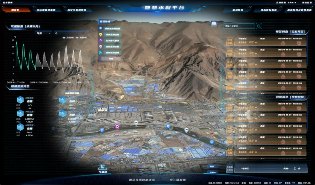 作為整個(gè)智慧水利平臺的中樞,駕駛艙集成了氣象情況、設備狀態(tài)、水體狀況、預警信息等關(guān)鍵數據,在航飛拍攝建模的二三維底圖上展示經(jīng)過(guò)綜合分析和統計處理后信息的宏觀(guān)態(tài)勢。為決策者提供一個(gè)直觀(guān)、清晰的宏觀(guān)視角,迅速把握流域整體情況。